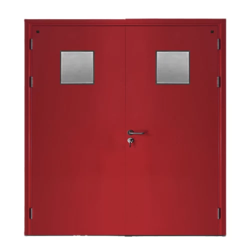 باب طوارئ سيفيكو صلب مدرفل علي البارد مع نافذة زجاجية مربعة موديل SF/DD زوجي حجم الباب 1900×1950 مم لون احمر